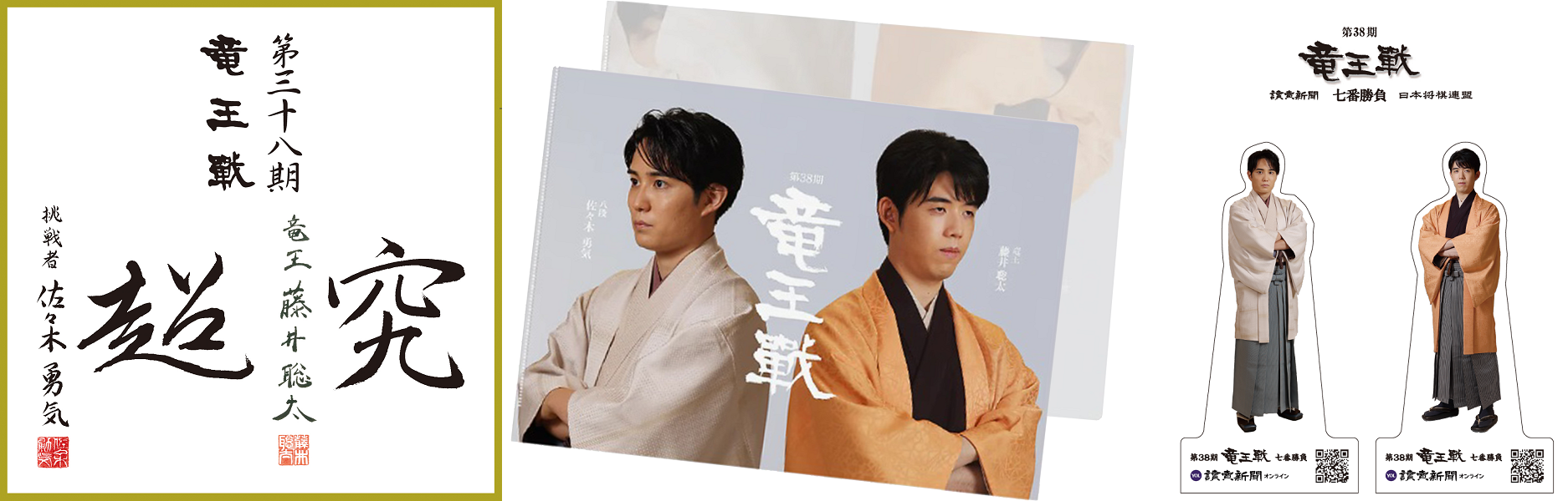 正解者の中から、抽選で、藤井竜王または佐々木八段の揮毫色紙(2人)、色紙風ミニタオル(2人)、第38期クリアファイル(3人)、第38期手乗りパネル(3人)をプレゼントします。