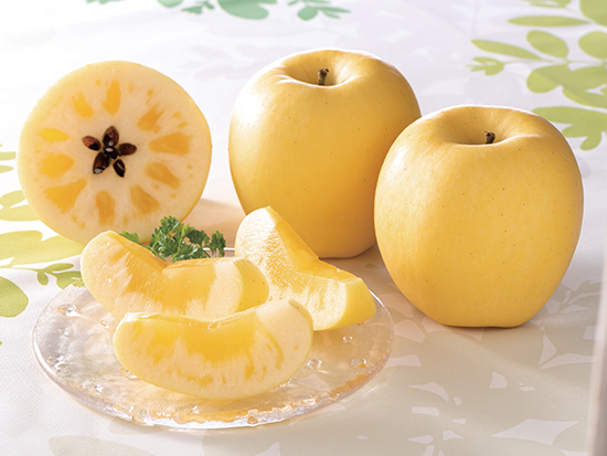 1個ずつ丁寧に袋掛けして育てられた美しい黄色の果実に、たっぷりの蜜が入った見た目にも華やかなりんごです。シャキシャキと歯ごたえよく、控えめな酸味でしっかり甘みを感じられます。