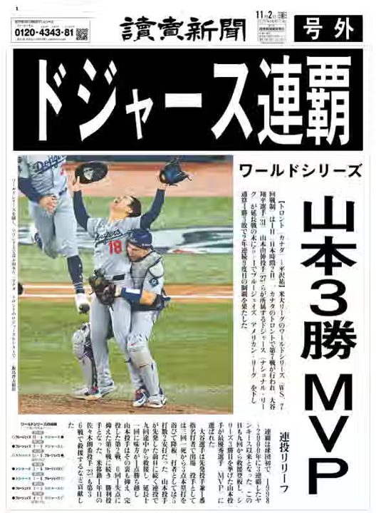米大リーグのワールドシリーズで、大谷翔平選手、山本由伸選手らが所属するドジャースが、2年連続9度目の制覇を果たしました。これを伝える読売新聞の号外を20人にお分けします。