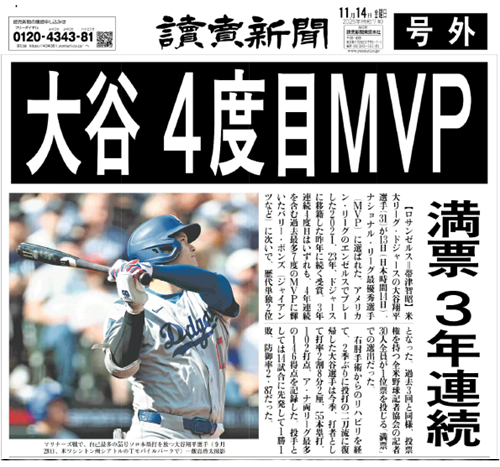 大谷翔平選手が大リーグ、ナショナル・リーグのMVPに選出をされたことを伝える号外が発行されました。今シーズンの各場面での大谷選手の写真と2018年からの大谷選手のメジャーでの投打成績が掲載された本号外を抽選で30人にお分けします。
