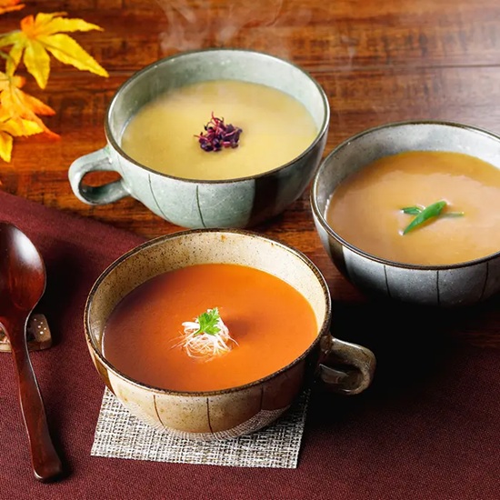 なだ万は天保元年(1830年)の創業。明治以降各界の著名人に愛されてきた老舗料亭。国内外に支店を展開し、伝統の味とおもてなしの心を継承し続けています。各素材の味わいを大切にしながら、じゃがいもをすり潰して、昆布や鰹(かつお)の旨(うま)みを加えて仕上げたポタージュ仕立ての和風スープです。温めるのはもちろん、冷製スープとしてもお楽しみいただけます。